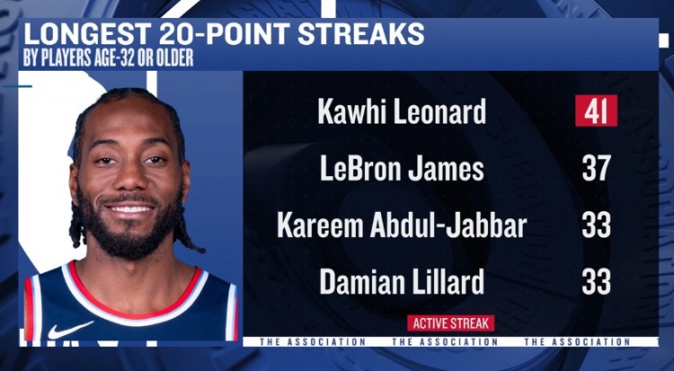 星空体育官网-32岁后连续20+榜:伦纳德41场居首 詹姆斯37场第2 利拉德33场第3