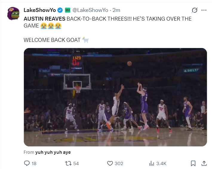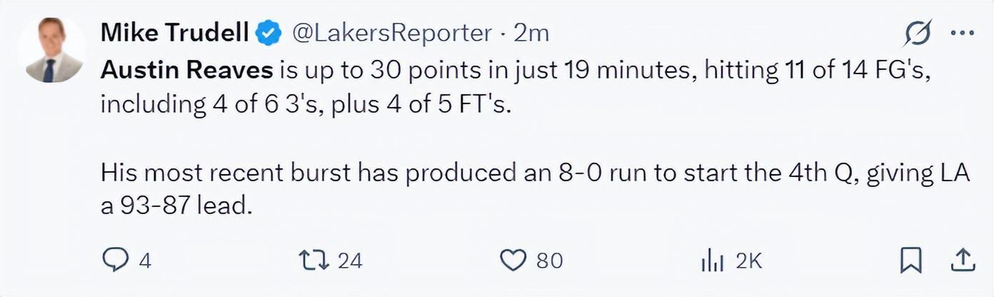 奥斯汀-里夫斯实在是太出色了,末节开场湖人还在落后,但在短短1分06秒的时间里里夫斯一人打出了8-0的攻势直接帮助湖人反超,湖人队记迈克-特鲁戴尔都觉得不可思议。