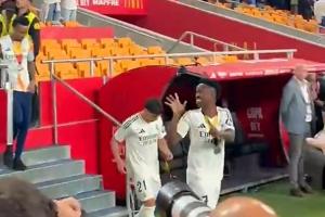 赛后在领取奖牌从看台上下来时,维尼修斯对着巴萨球迷比划5的手势。